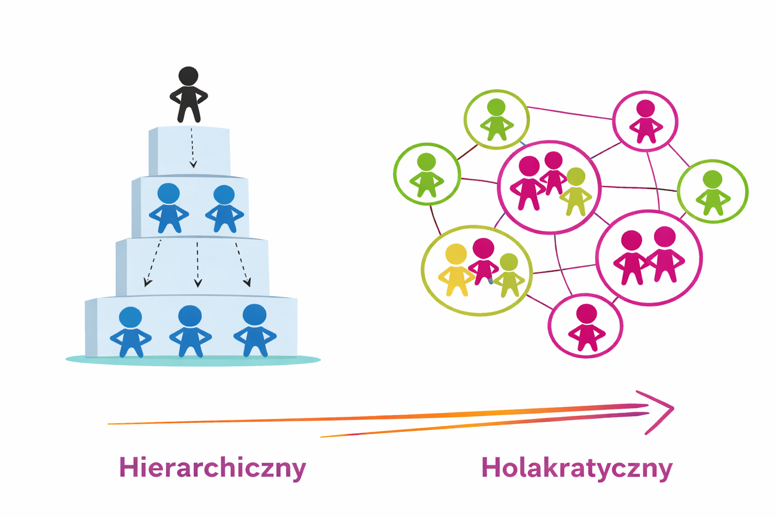 Różnicę między tradycyjnym, hierarchicznym modelem zarządzania a tym w turkusowej organizacji (zwanym holakratycznym), prezentuje powyższa grafika – w praktyce oznacza to, że możesz być częścią kilku jednocześnie samoorganizujących się kręgów (zwanych również holonami) i pełnić różne w nich role (w tym zarządcze).